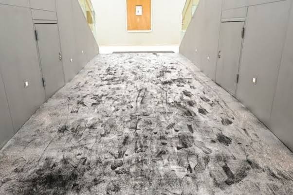 Essa instalação artística com significado simbólico nos lembra que nem tudo que parece sujo deve ser limpo — principalmente num museu. E que uma boa placa informativa faz milagre!