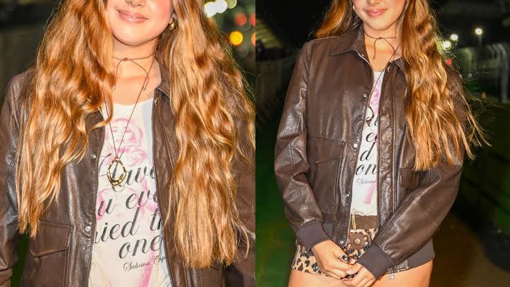 Para a ocasião, Sofia apostou em um short com estampa animal print, combinado com jaqueta de couro em tom escuro e uma camiseta estampada da cantora Sabrina Carpenter, uma das atrações da noite. O conjunto, finalizado por coturnos marrons, traduziu a vibe festival com toque fashionista, equilibrando ousadia e conforto para a adolescente.